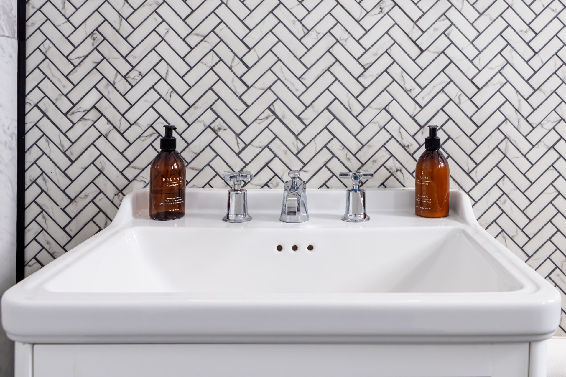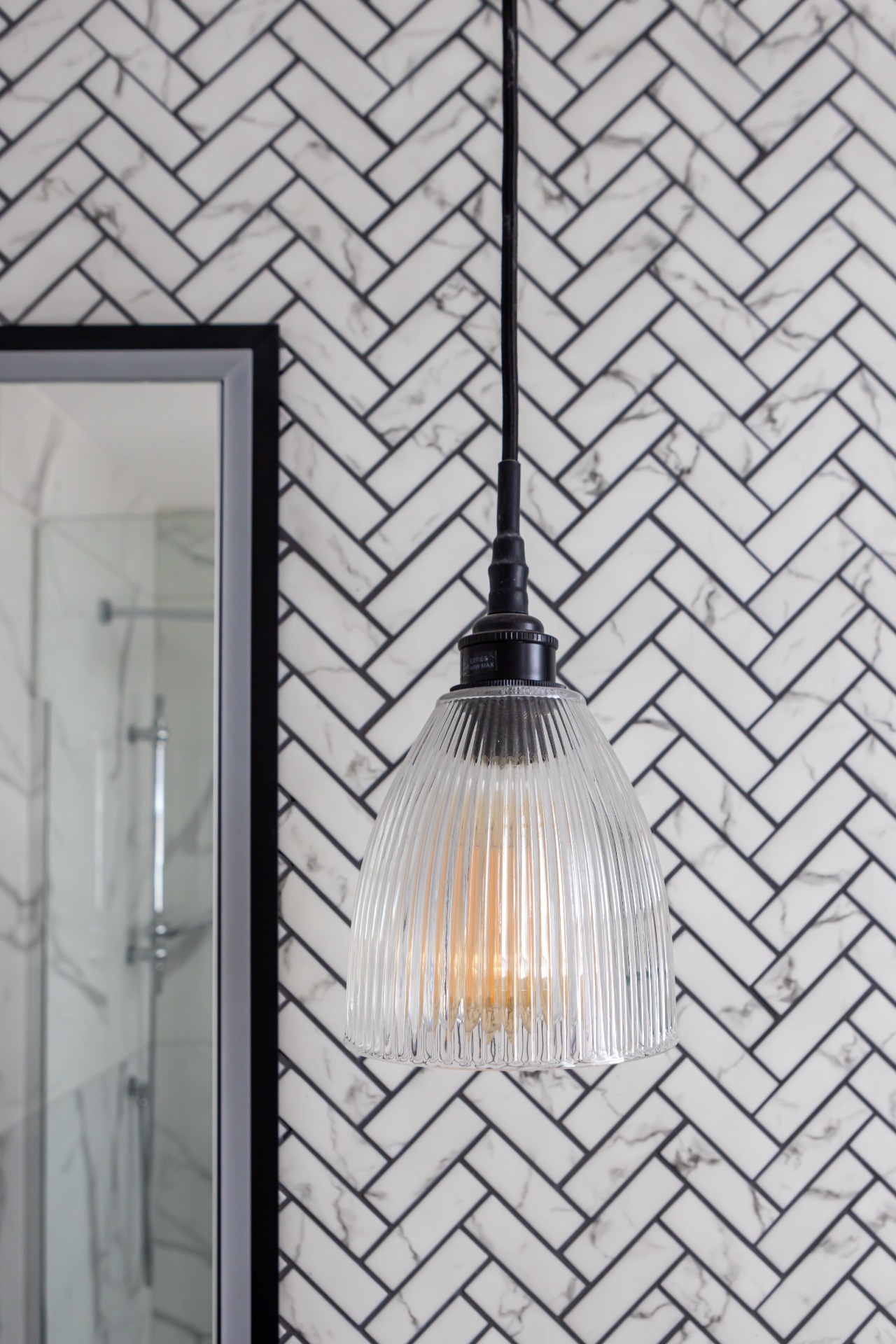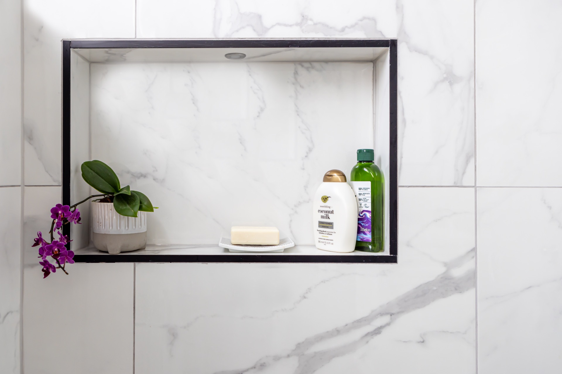 BRIEF: Large format Tiles in the Shower to minimise Grout lines but Client wanted a feature tile on the Basin & WC wall