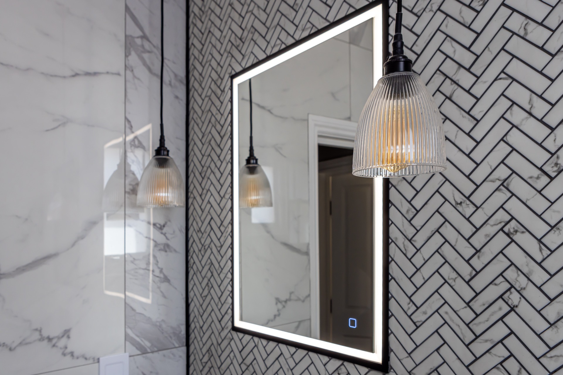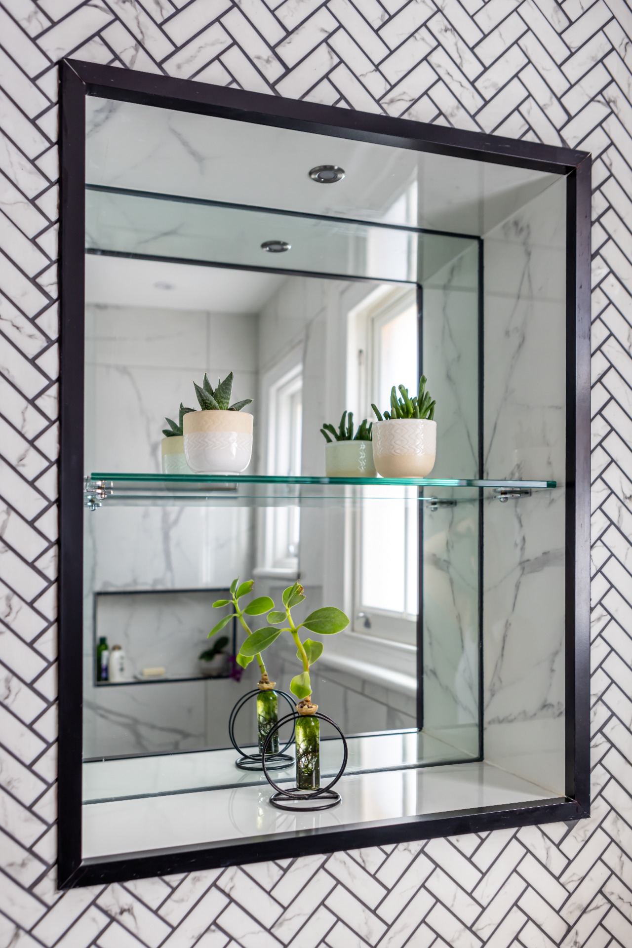 PROJECT: Family Shower Room in St.Margarets, using Large Porcelain Tiles in the Shower area and main Walls offset with the feature wall in recycled Glass Mosaics used to great effect with Matt Black Trim, recessed Mirror Cabinet and Display recess