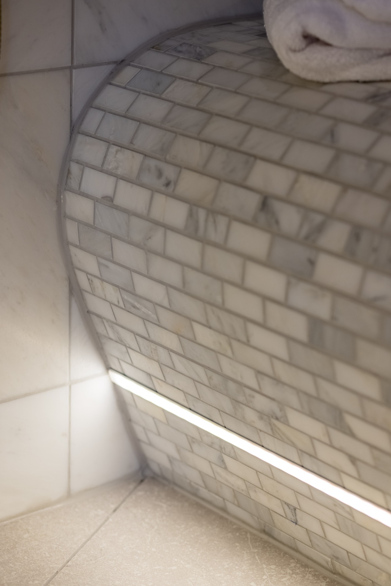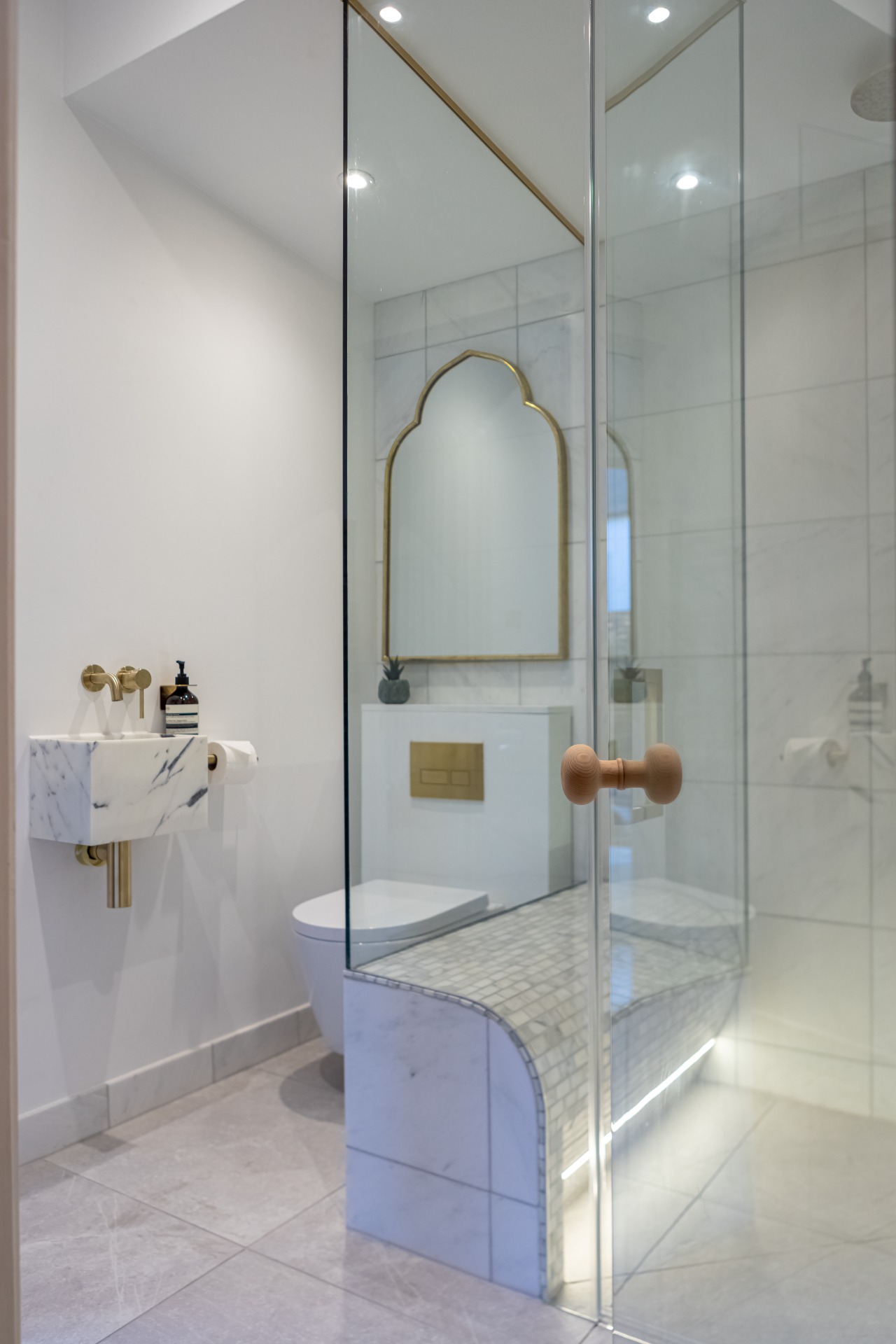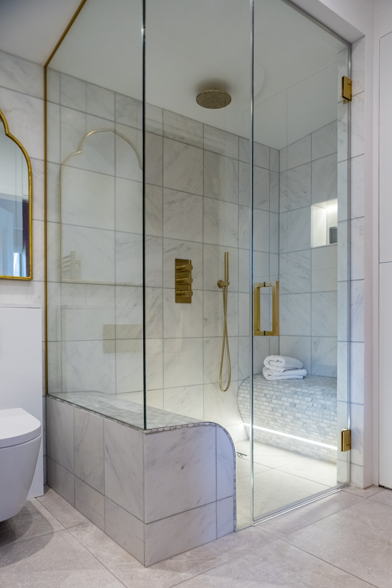 PROJECT: Steam Room and Shower using Honed Marble Tiles and Mosaic feature seat, the Brushed Brass fittings add a touch of colour to this Project