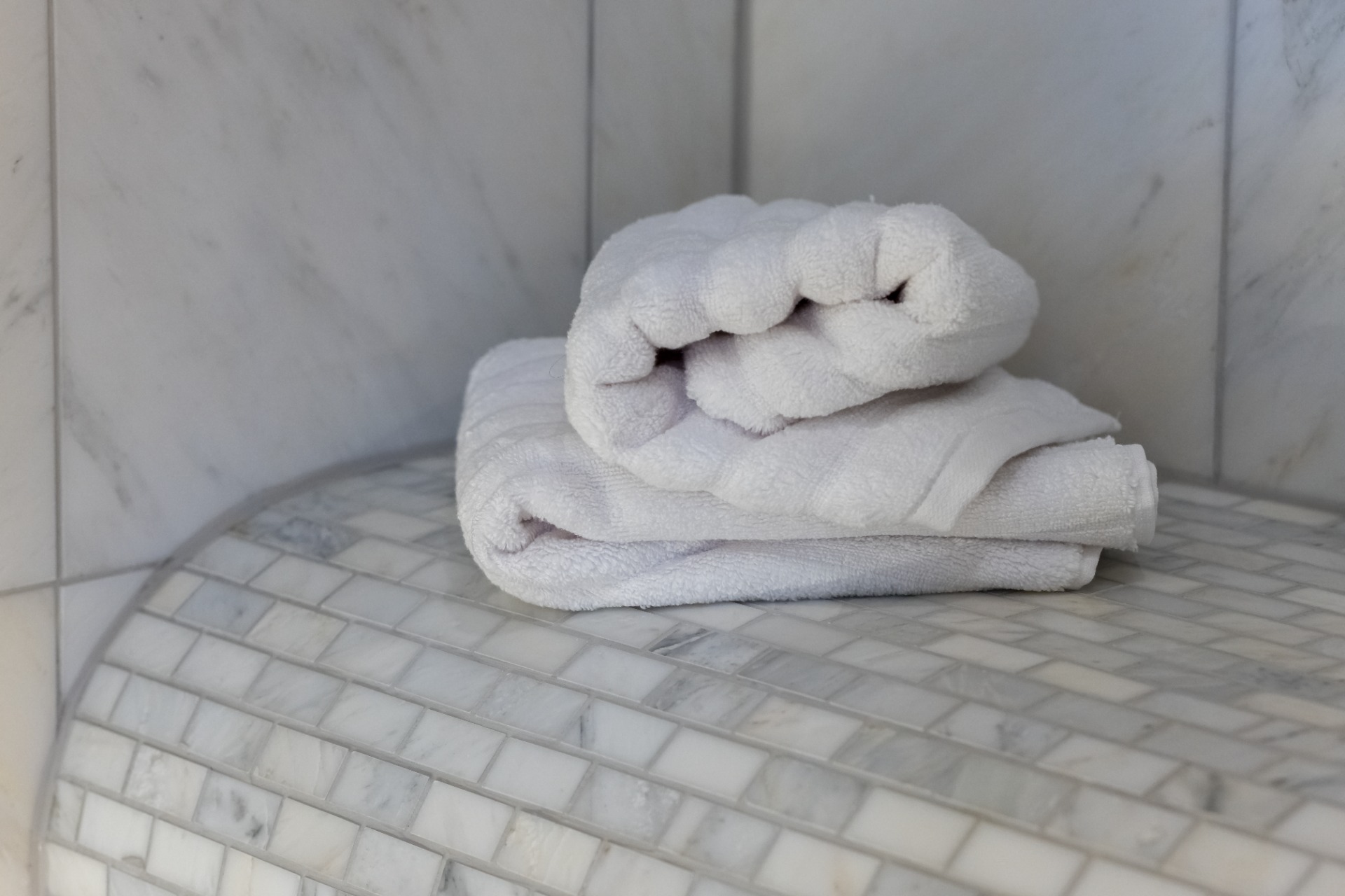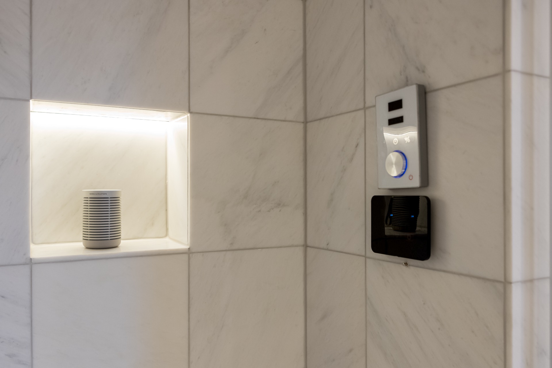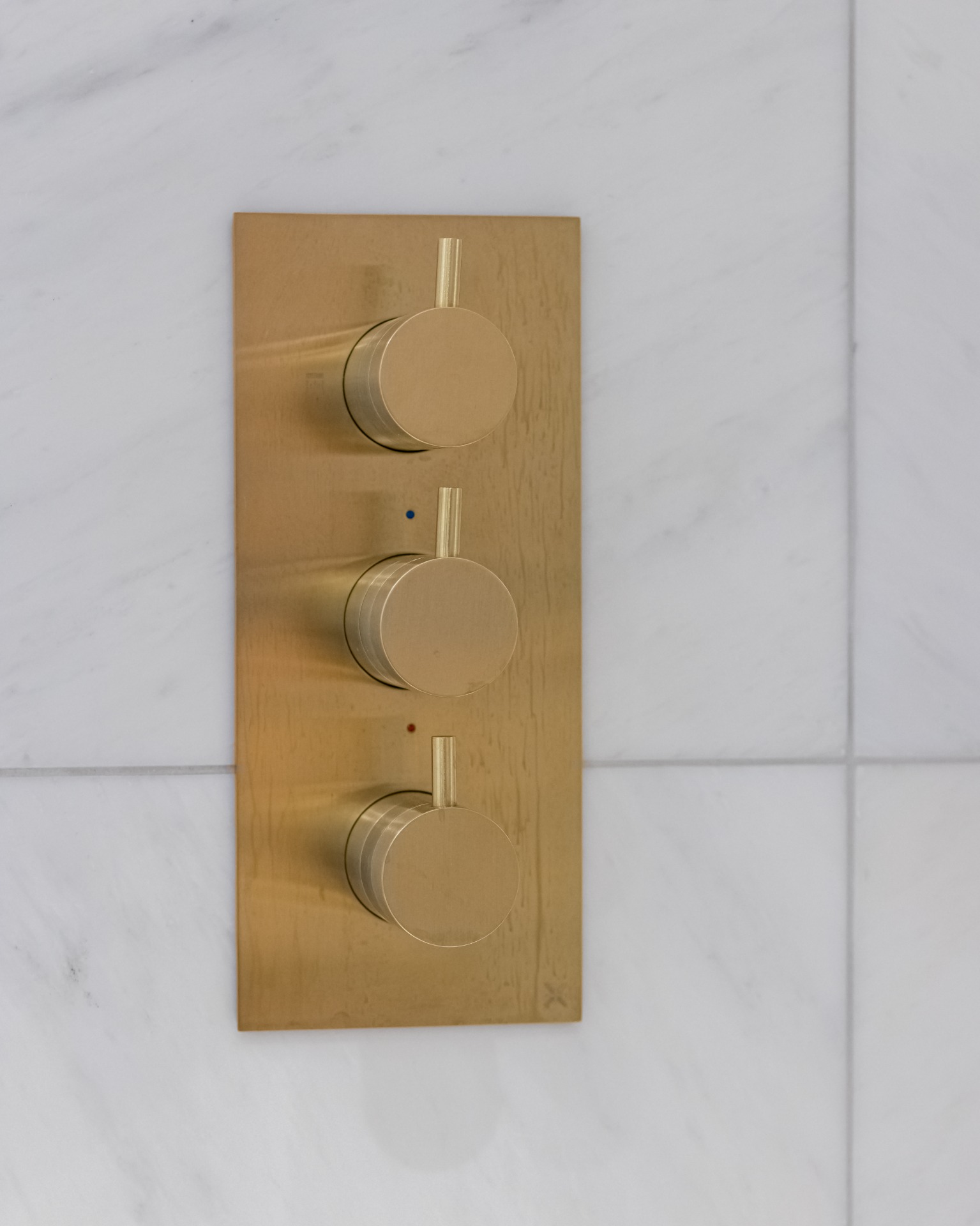 PROJECT: Steam Room and Shower using Honed Marble Tiles and Mosaic feature seat, the Brushed Brass fittings add a touch of colour to this Project